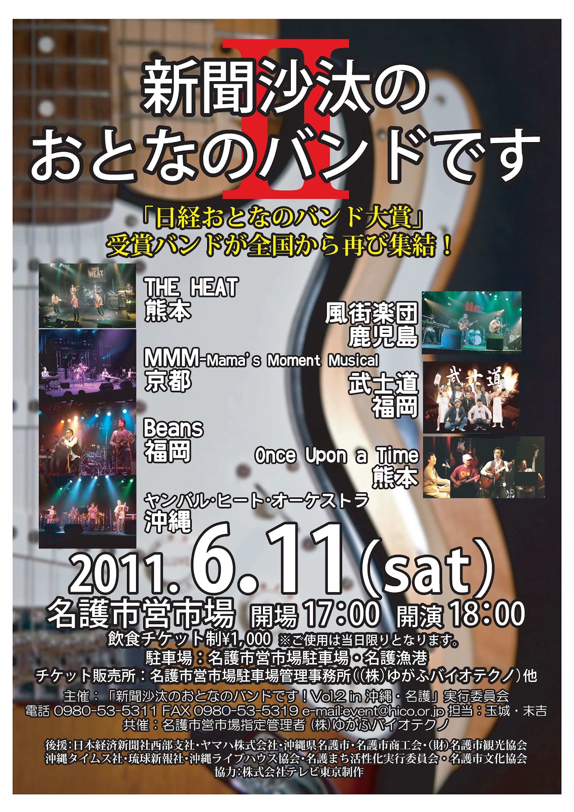 6・11 いよいよです。 2011/06/8 いよいよ迫ってきました。 大人のバンドイベント 名護まち上げて みたいな感じになってきました。 このイベントが定着して 音楽をとうして、やんばるのよさが 伝えられる イベントに成長 しますように。 お知らせ一覧に戻る
