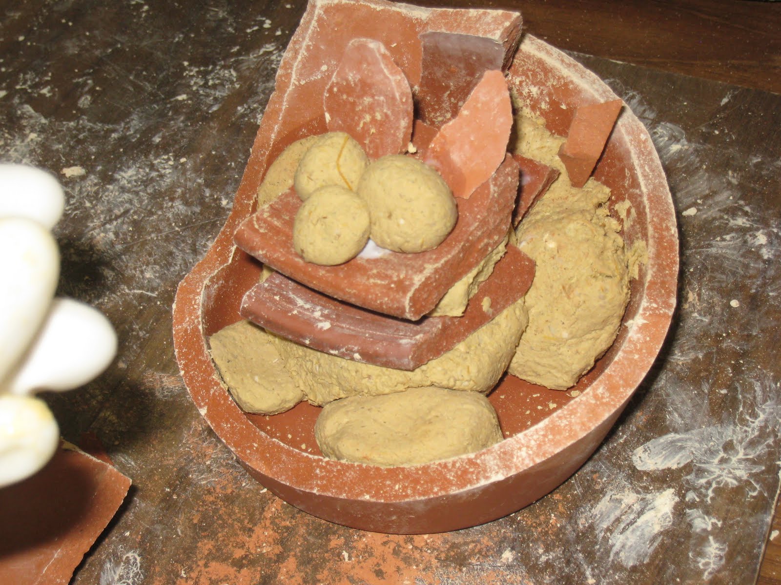 割った瓦の形状でイメージを膨らませ、シーサーの形にしていきます。